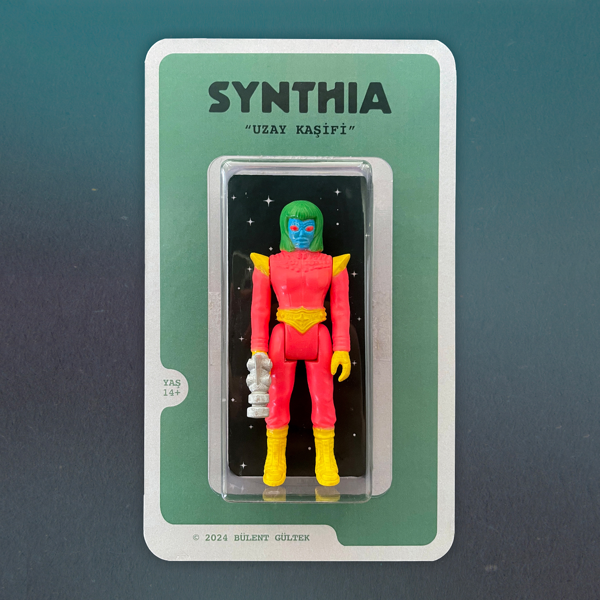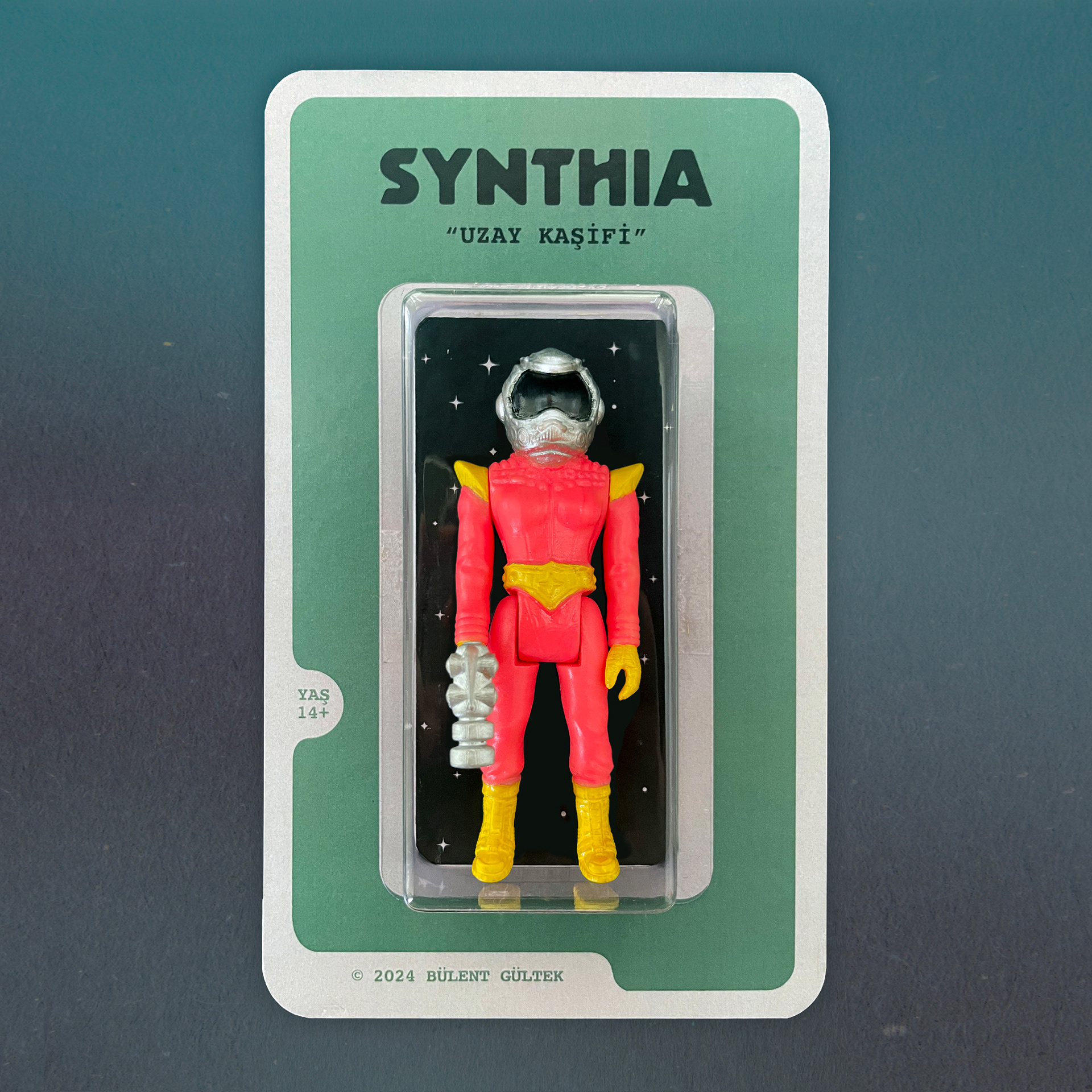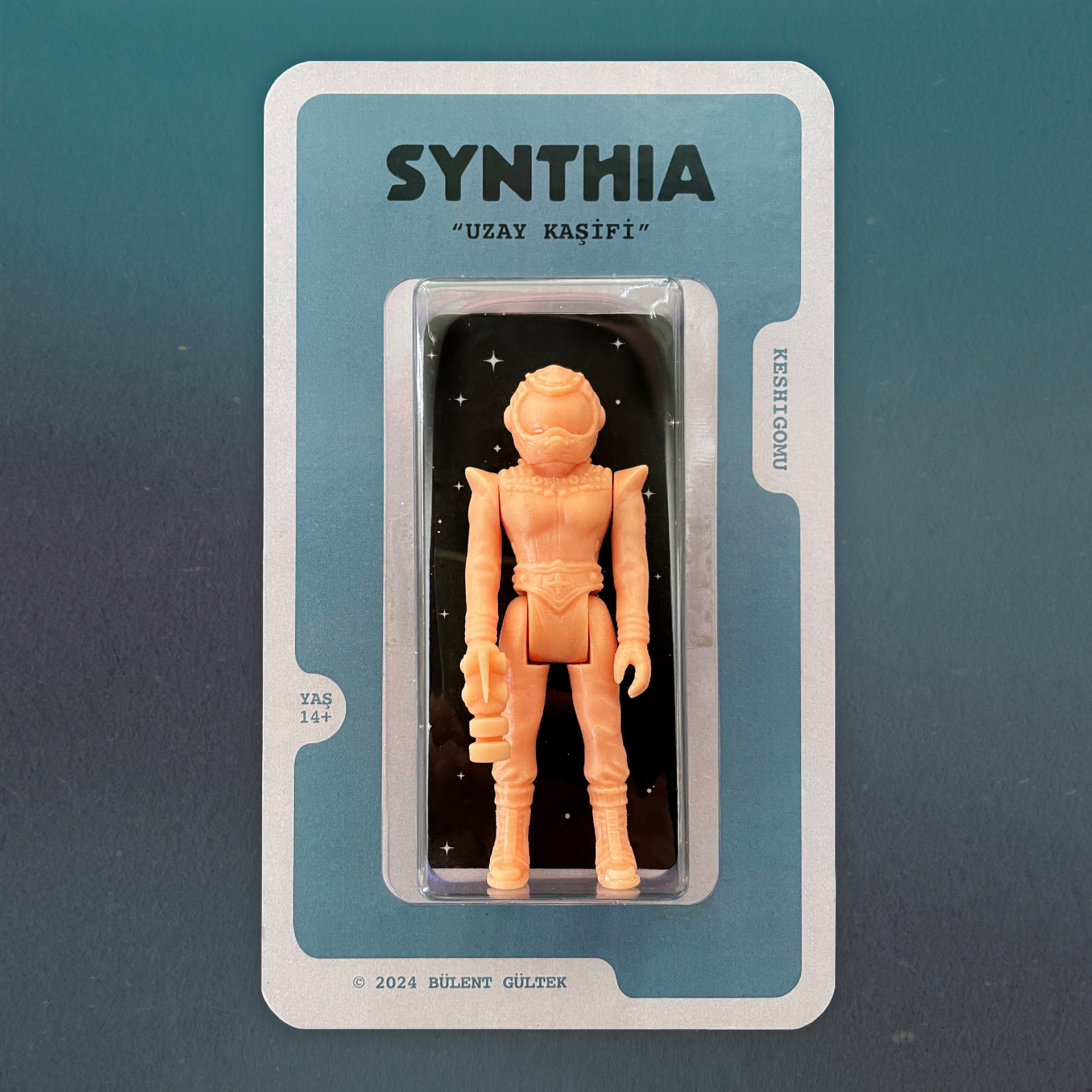 With the “Space Explorer” versions of the character, this time I customized the packaging design differently from the classic Kenner style dimensions. I preferred to use a simple layout on the front of the cardboard back. I added the 14+ age information to the character’s name and version information, and my name and production year below as the designer.