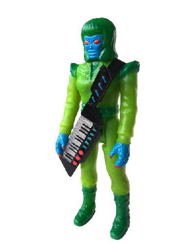 I proceeded with a synth-pop theme and a character that would evoke the 80s. He transformed into a mutant character and took shape as a synth pop enthusiast for the keytar instrument, a mutant keytarist. I named the character Synthia based on his favorite music style. Then, I prepared the packaging design in a retro toy format with a cardboard back, along with a different colored version.